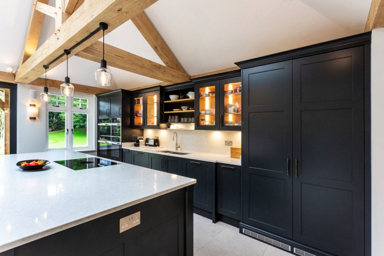 Dark cabinetry and statement kitchen islands feel luxurious rather than heavy. The contrast brings balance; dark colours can feel grounding, whilst aged brass cabinetry handles and quartz countertops add warmth and refinement.
